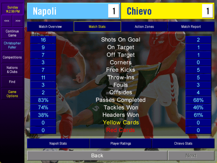 At that point, I was wondering if this game was too easy. Perhaps I had accidentally found a game-breaking 4-4-2, just by pushing the wide players forward. Or perhaps this Napoli team was simply too strong for Serie B.