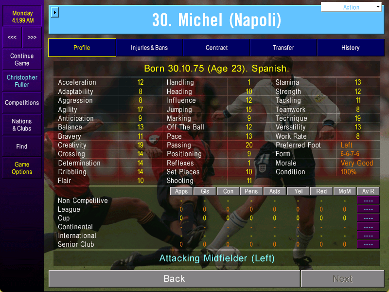 Let’s kick off 1999 with some new signings – such as this left-winger who can cross the ball well AND run quickly. We forked out £1.2million to bring in the very skilful Michel from Rayo Vallecano. The real-life Girona manager has taken La Liga by storm in 2023/2024, but let’s hope his virtual self can make a similar impact on the pitch in Serie B.