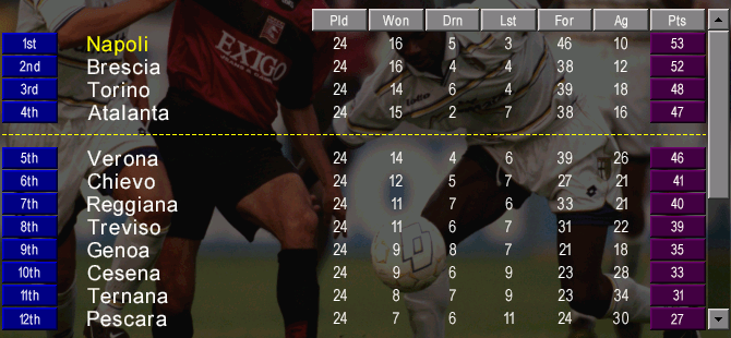 Having scored 40 goals in 20 league games, we were now NINE points clear of 5th-placed Verona. Though Brescia and Atalanta were doing their best to keep the title race competitive, promotion was surely ours to lose.
