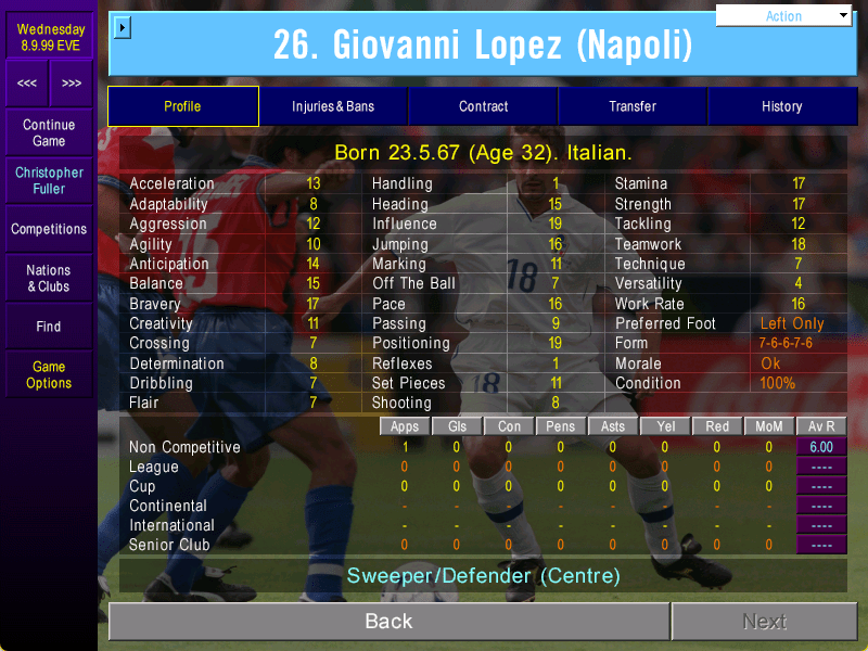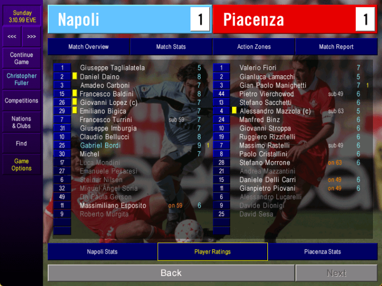 First up were a couple of former Valencia full-backs. Amadeo Carboni – who played for Italy at Euro ’96 – moves to Naples following a single season with Perugia. Carboni has just turned 34 (which makes him six months older than Francesco Turrini), so he’s clearly not a long-term signing, but he should last us a season or two.