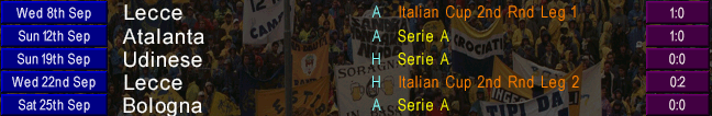 No such joy in our first home game, as Bordi and Bellucci forgot their shooting boots against Udinese. They were even worse at Bologna, though a tight defence ensured that we were still unbeaten at the end of September. In the league, anyway.