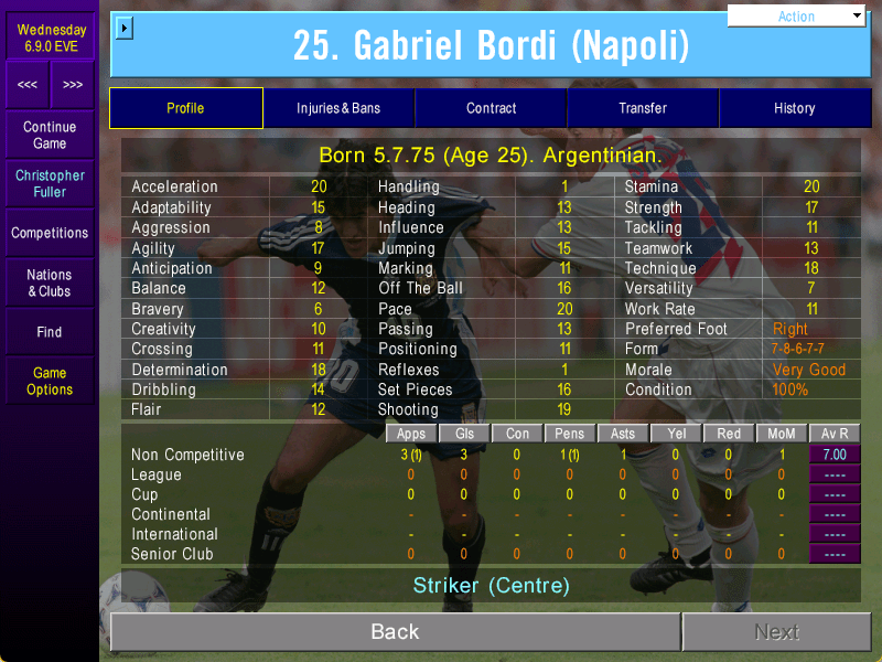 Ageing winger Francesco Turrini was finally put out to pasture after failing to build on his outstanding 1998/1999 season, while backup centre-half Steinar Nilsen went home to Norway. Surprisingly, the Napoli board were most upset that I released Aziz Ansah. Yes, the Ghanaian teenager has unbelievable tekkerz, but he’s still glacially slow.