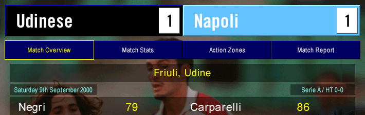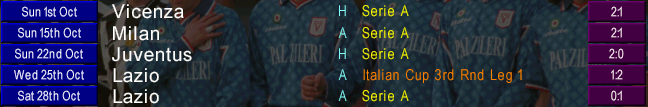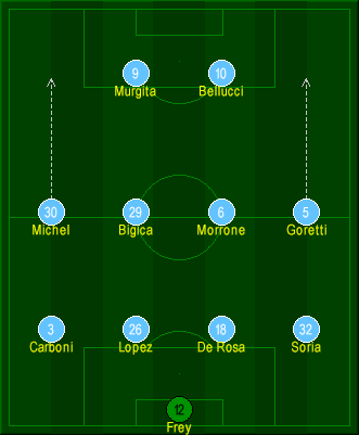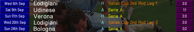 Meanwhile, we avoided another Coppa Italia upset by blowing Serie B Lodigiani away in Round 2. Bellucci scored twice as many goals in the first leg alone as he got in the entire 1999/2000 season. Much tougher tests would await in Round 3, as we were drawn against Lazio.