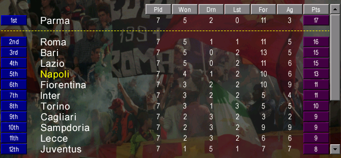 Ronaldo was off to a good start at Fiorentina (scoring six goals in as many games), but it was unbeaten Parma who led the way early on, with champions Roma just behind. Juventus’ love of stalemates and Milan’s new fear of goalscoring meant that the sleeping giants were barely above the relegation spots.
