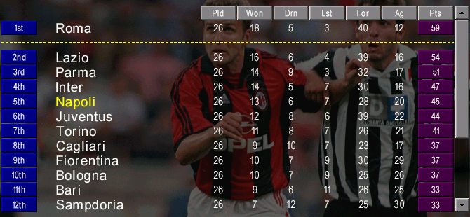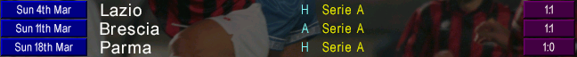 The 3-4-1-2 would make its premiere against none other than the league leaders – Sven Goran Eriksson’s Lazio (he didn’t leave to become England boss in this universe). I wasn’t expecting instant results, but at the very least an improvement on the 4-0 tonking at Juventus’ hands last time out.
