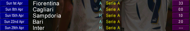 Bordi’s hot streak continued with a fifth goal in six games, before a 90th-minute Bellucci penalty put Bari to bed. We now needed just one more victory to ensure we had at least some form of European football next season. Bring on Internazionale…