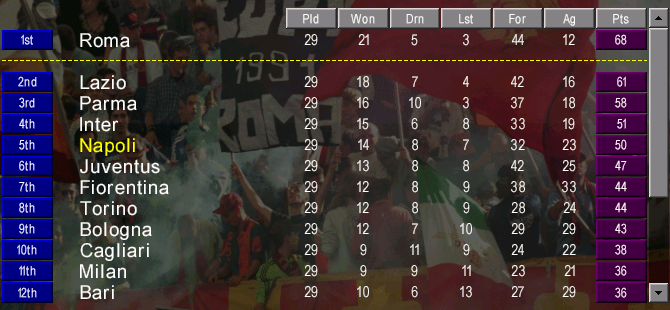 Roma would be joined in next season’s Champions League by their bitter rivals Lazio. Fiorentina had won their second Coppa in three years, and thus would enter the Cup Winners’ Cup again.