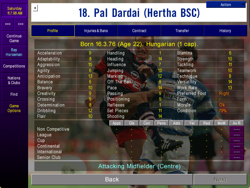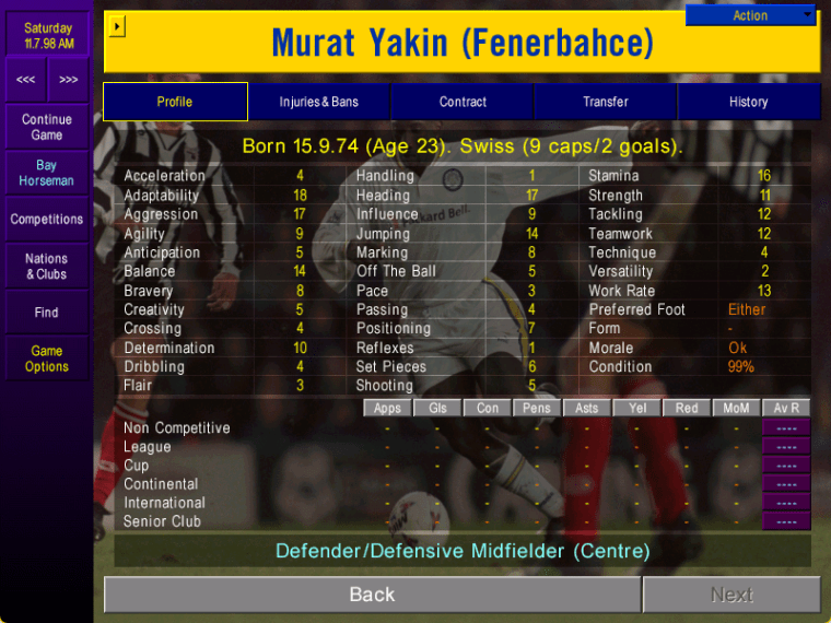 So let’s instead check out his assistant Florin Constantinovici. Yes, there’s a typo in his CM3 profile, which is also missing the three Romania caps he earned in the early 1990s. That being said, Florin still looks pretty strong as a centre-half… if you ignore the low Bravery and Determination.