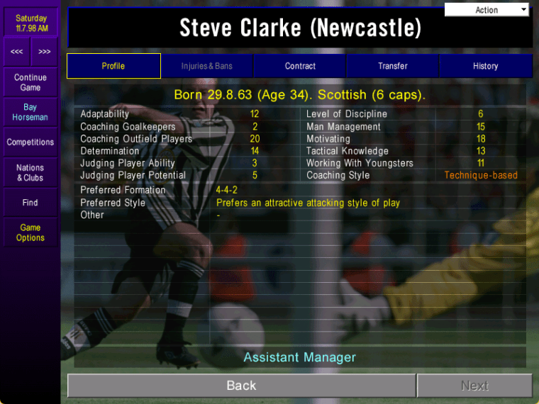 At least we know where Steve Clarke is on CM3. After finishing his playing days as a Cup Winners’ Cup winner with Chelsea, the former right-back had started his coaching career as Ruud Gullit’s number 2 at Newcastle. It would be another 20 years or so before he got his dream job at Hampden Park.