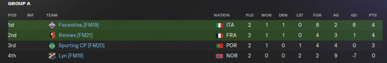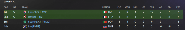 My unbeatable Rennes team from FM21 will be the clear favourites to win Group A, while Fiorentina’s talented attackers and Sporting CP’s stubborn defence are set to go toe-to-toe for a Semi Final place. Spare a thought for Norwegian minnows Lyn, who will do well to take anything from this group.