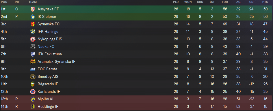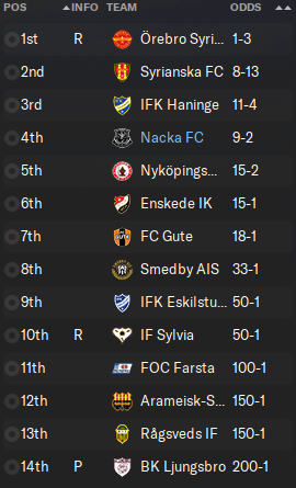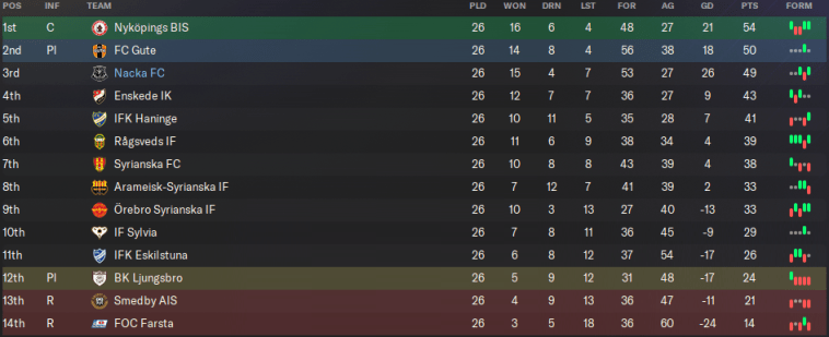 Nacka are projected to finish 4th in the 2024 season. After my last save, I’m honestly relieved that we’re not 91-1 on for promotion!