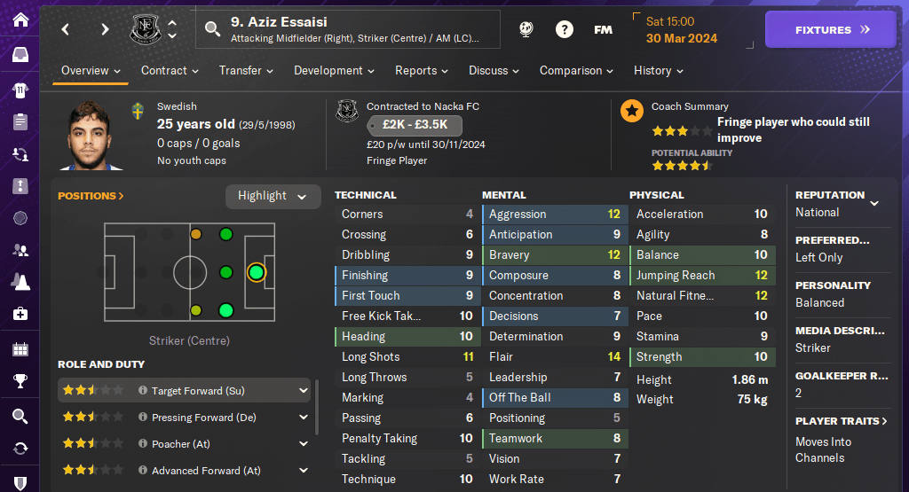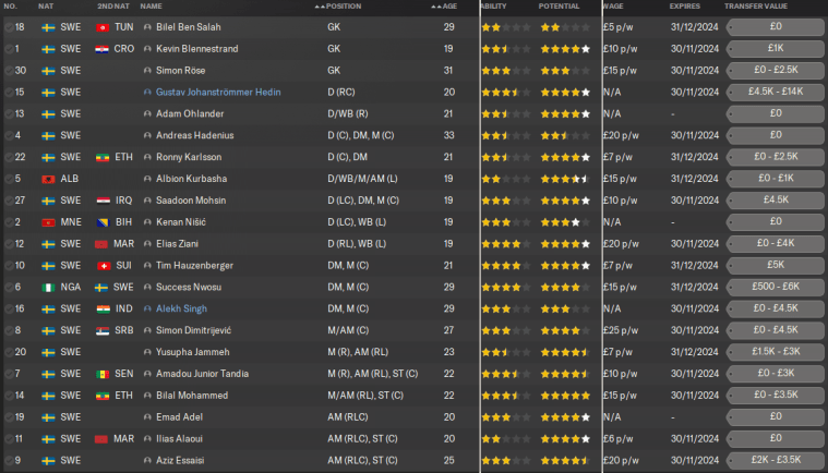 So, here’s a first look at the Nacka squad I’m taking into the 2024 season. We have a very young defensive line (with one notable exception), but we do also have a fair bit of quality in midfield and on the flanks.