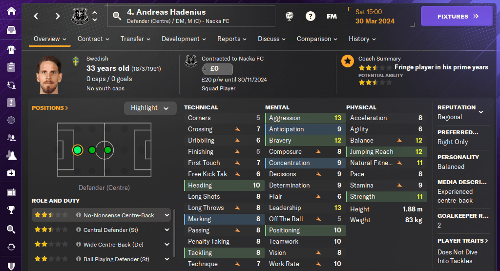 And just to show that I’m not managing a kindergarten, here are a couple of more experienced lads. We were lacking a leader, so I brought in centre-back Andreas Hadenius (once of Dundee) to be our new captain. He’s brave and consistent, but my only worry is that he can’t tackle. Or man-mark. Or run.