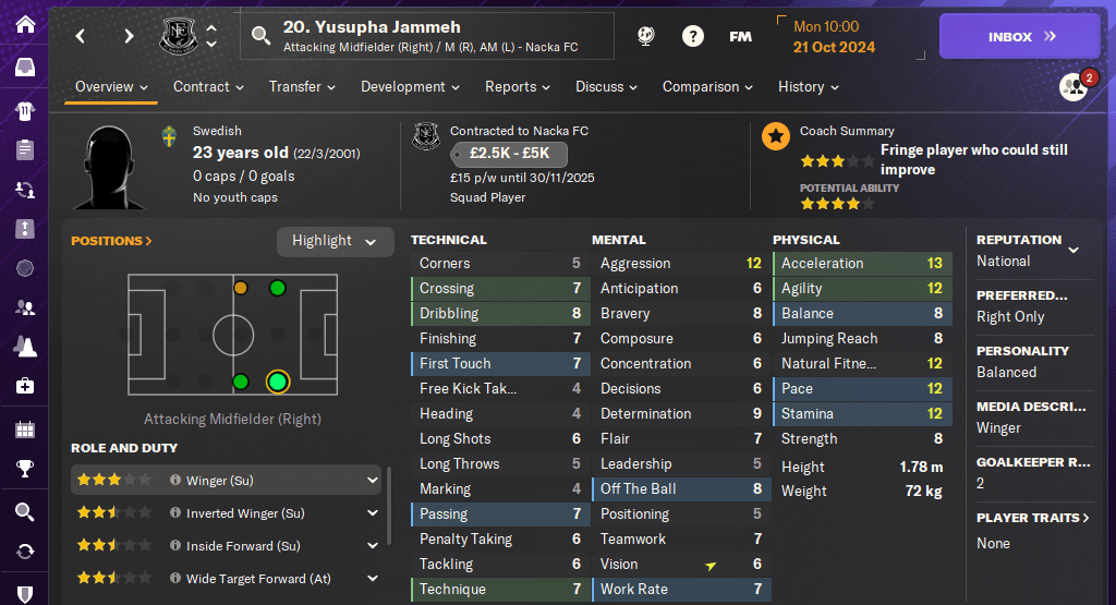 Another loanee is the young Hammarby right-back Gustav Johanströmmer Hedin. Technically, he’s not great, but his mentals and physicals are solid enough for this level.