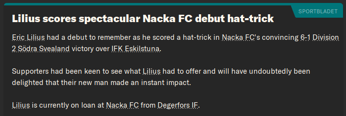 [Sigh] Okay, so I might have got desperate on deadline day. I trialled several other strikers who looked so much better, but they all wanted too much money. I was probably most excited about 20-year-old Eric Lilius, until he got poached by Degerfors in the Superettan.