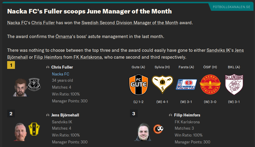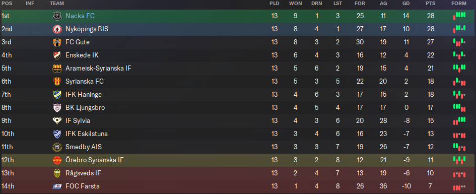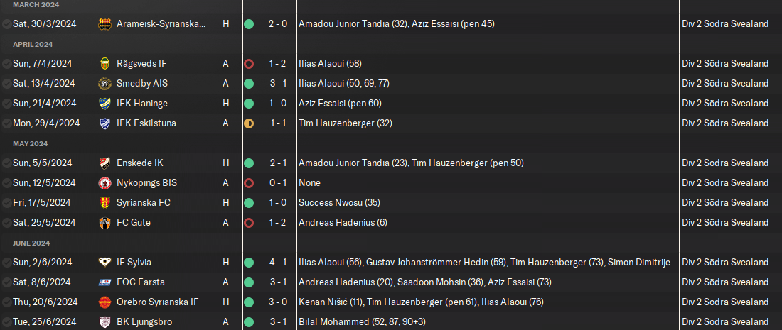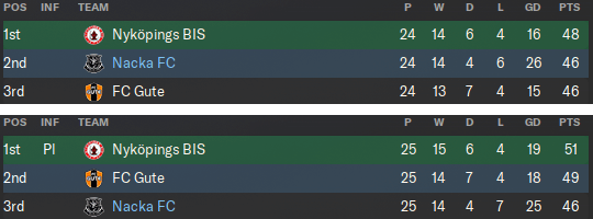 Somehow, we had snuck into top spot on goal difference, with Nyköping and Gute hot on our heels. Staying there and securing automatic promotion would be a big ask, but with two or three more quality additions, I believed we could give it a good shot. Time for some summer-break scouting…