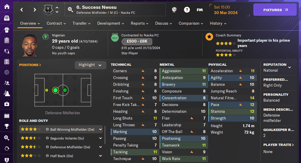 Seeing as we’re stuck with Football Manager 2024 until March, I’m going to fill the void with a new save. I have taken over Nacka FC, who play in the fourth tier of Swedish football after a rapid ascent through the leagues. I also hope this save can rekindle my love for FM, after my frustrating experiences with Millwall and Wieczysta Kraków.