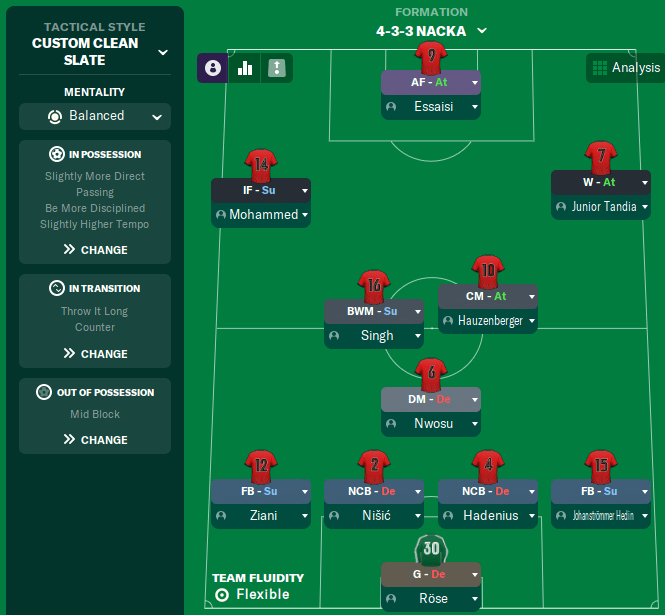 My biggest concern, however, was that we weren’t creating enough high-quality chances for our forwards – and even when they did, Essaisi was useless at converting them. To underline that point, Aziz scored precisely ONE goal from open play (plus two penalties) before I gave up and dropped him. 20-year-old Ilias Alaoui did net a hat-trick at Smedby early on, but he lacked the composure to lead our line consistently.