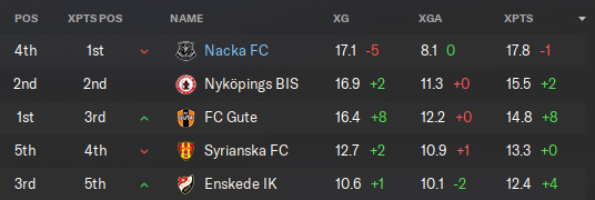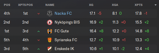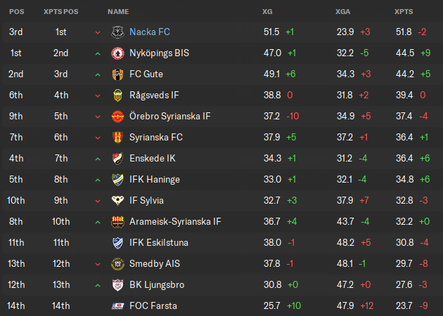 Despite having the highest xG in our division (by 4), as well as the lowest xGA (by 8!) AND the most expected points (by 7!!), we missed out on promotion because we couldn’t hold our nerve against our rivals. We held the lead in three of our four meetings with Nyköping and Gute, yet only came away with a single point.