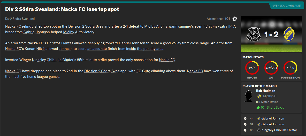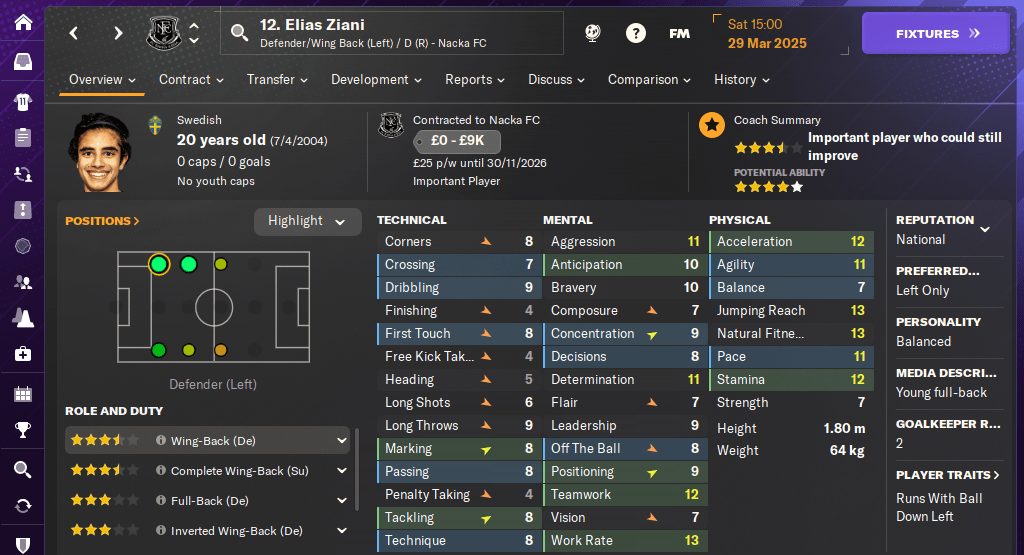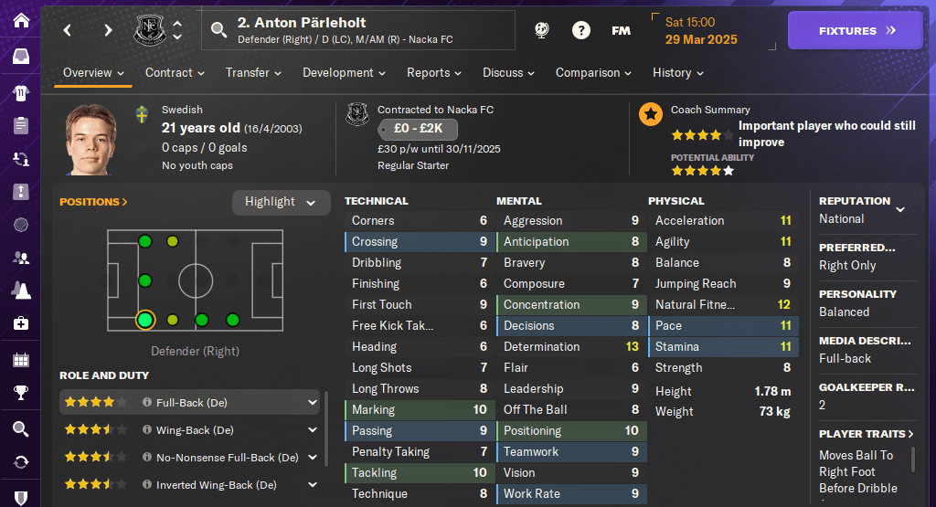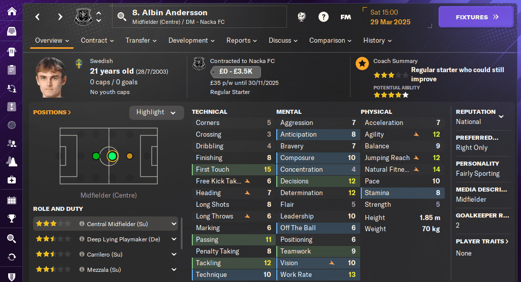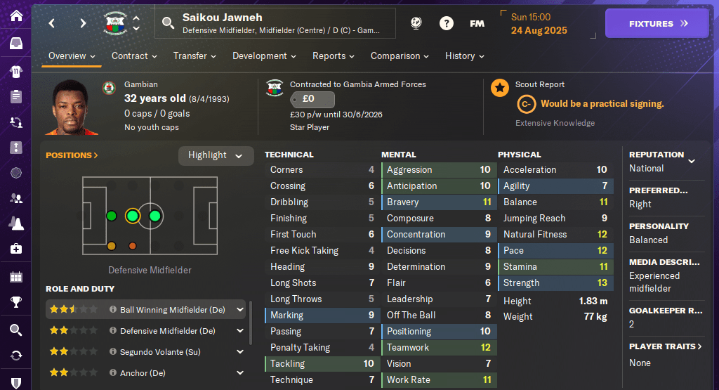 If it ain’t broke, don’t fix it. I made very few changes to the Nacka squad in the summer transfer window. The only player to leave was one of my pre-season signings – backup holding midfielder Saikou Jawneh, who returned home to the Gambia after making only eight appearances for us.