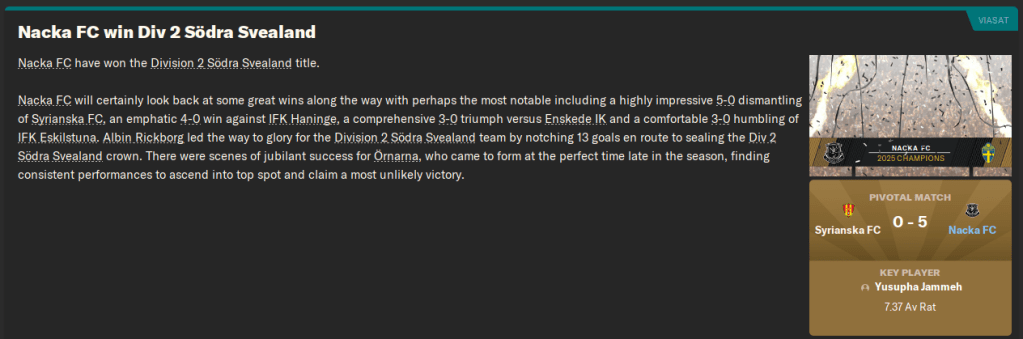 Now it’s 2025, and expectations are high. Can Nacka’s new signings bring us some actual silverware and take us up to the Ettan? Or am I going to have another nasty case of second-season syndrome?