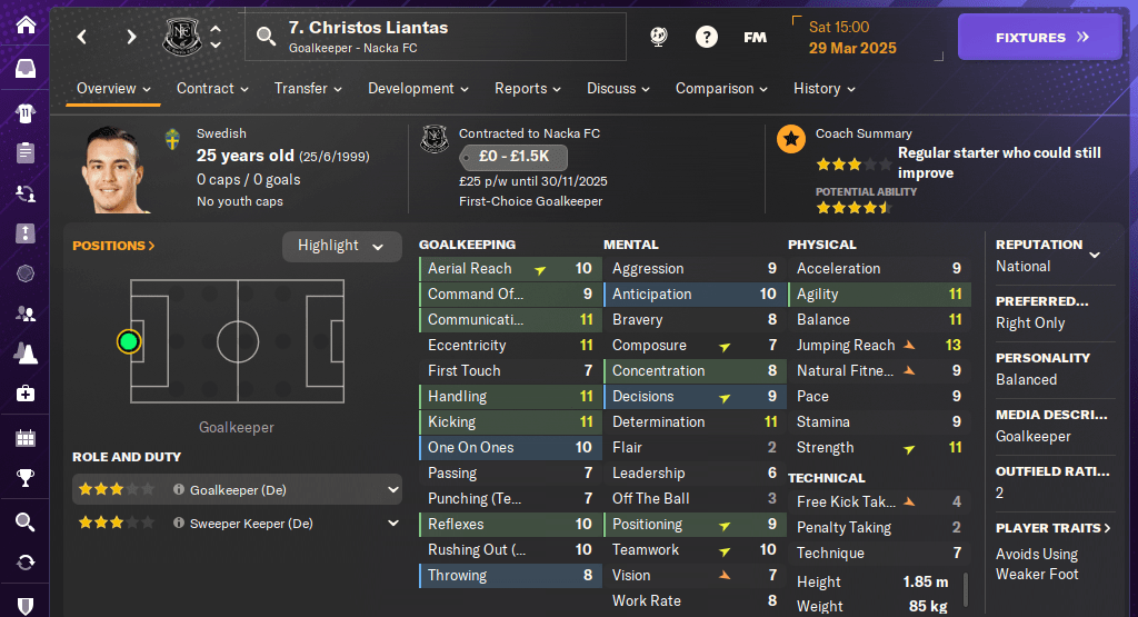 My priority was to sign a reliable and consistent shotstopper, and so I went for this Greek god. He’s got solid handling, agility and kicking, and his decision-making isn’t terrible either. If you’re wondering why my new goalkeeper is wearing the number 7 shirt, his full name is Christos Ronaldo Liantas.