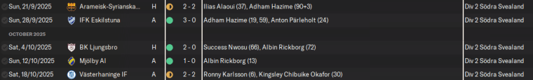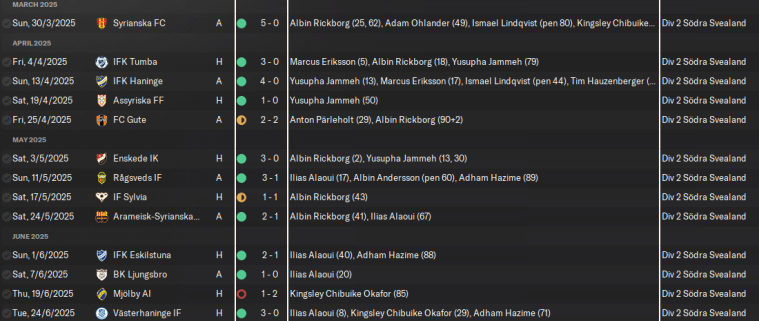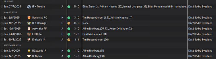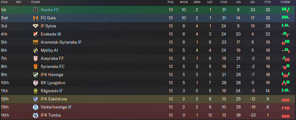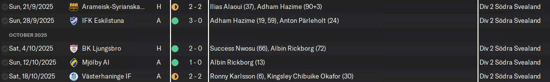 Of course, we missed about 20 chances in the very next game and barely scraped a draw at Enskede. Jammeh’s goals had almost completely dried up, but Rickborg bounced back from his poor form to earn us a couple of narrow wins over Rågsved and – more importantly – Sylvia. I’m sorry, Nan.