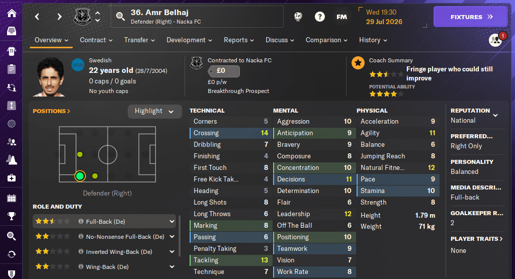 I also released Pärleholt’s backup Adam Ohlander (he’s just not good enough) and signed two more right-backs. Amr Belhaj isn’t yet as defensively robust as his predecessor, but he has great crossing ability and plenty of potential to grow. Zack Lindgren is a bit older and stronger, and he joins us on loan from… Täby.