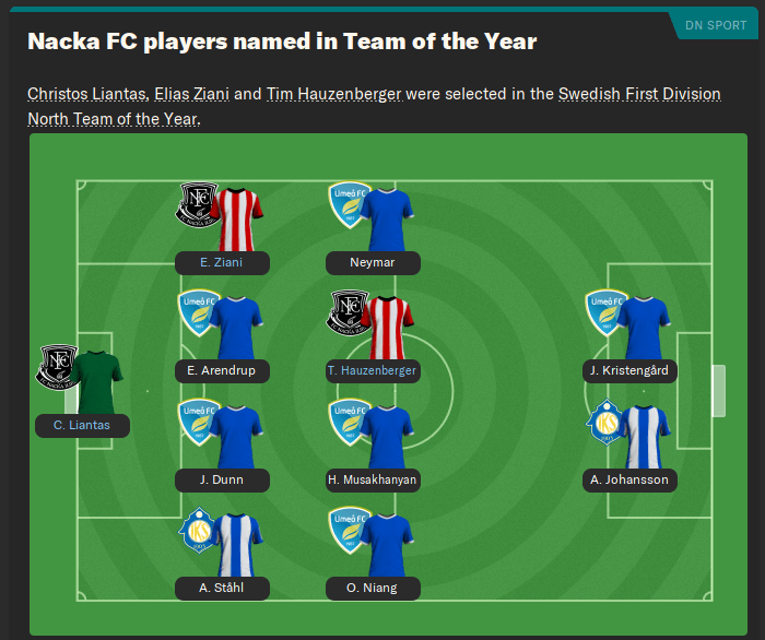 Liantas was largely blameless for our defensive frailties – indeed, he was voted the BEST goalkeeper in the Ettan Norra! Joining him in the league’s best XI were midfield dynamo Hauzenberger (who got 19 goal contributions!) and play-off hero Ziani.