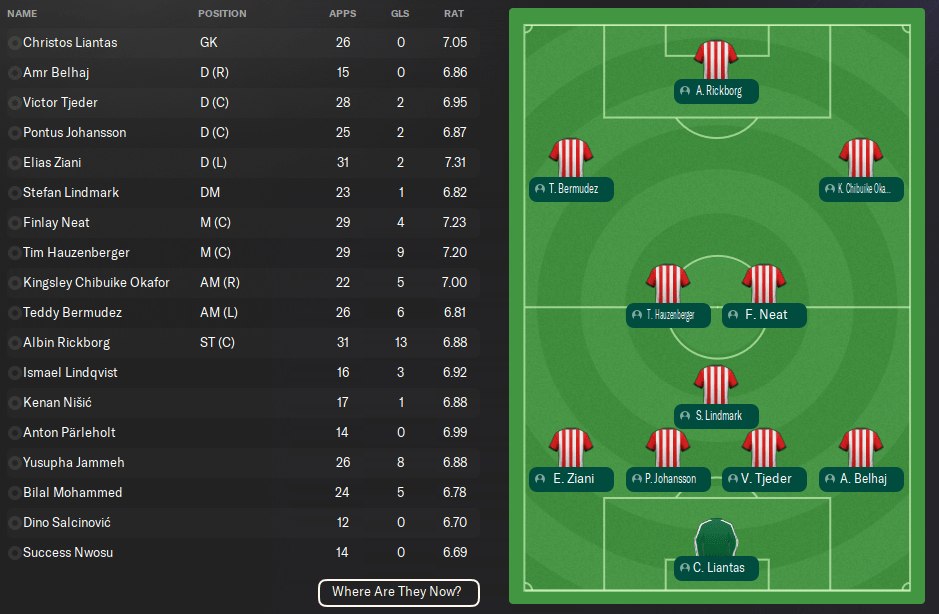 Christos Ronaldo Liantas (aka CL7) overcame a shaky start to become a reliable goalkeeper, though his pre-season form has given me cause for concern. I’m also worried that more reputable clubs might try to unsettle our brilliant young left-back Elias Ziani again. Unfortunately, right-back Anton Pärleholt‘s head has already been turned, so he might need to be replaced sooner or later.
