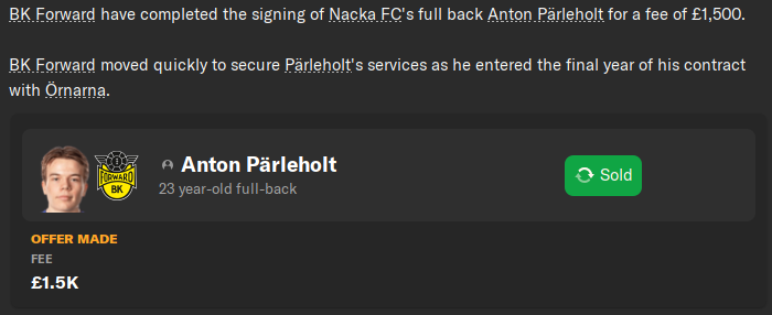 Of course, Pärleholt was free to sign a pre-contract with another club within six months of expiry – and because he was still waiting on a promise, I couldn’t offer him a new deal. I was even more annoyed when he chose to sign for BK Forward – a Division 2 club! So I decided to save some money and sell him now for £1,500.