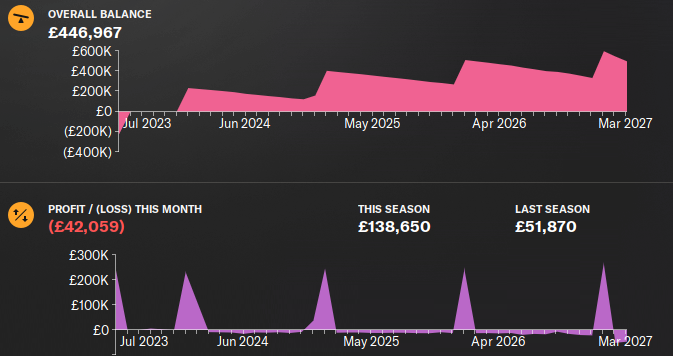 In the Swedish lower leagues, most of our money comes through sponsorship deals, so there’ll be a huge spike in our bank balance when they get paid out in December. Our balance will naturally decline gradually for the next 12 months, but so long as we don’t spend way beyond our means, we should still be financially okay by the end of the year.