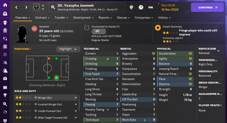 Take Yusupha Jammeh – the explosive right-winger who was our Player of the Season in my first two years at Nacka. He enjoyed a great start to the following season in the Ettan Norra, but his form collapsed from September onwards. My assistant also says he’s only a “leading Division 2 player”, with not much more potential to improve.