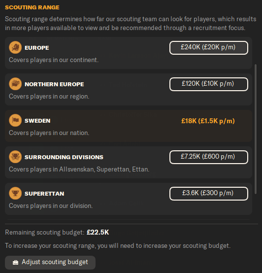 Instead, you can divert some of your transfer budget into your scouting budget. You can then expand your scouting range and scout other nations in your region, even if it’s only for a few months during the transfer window.
