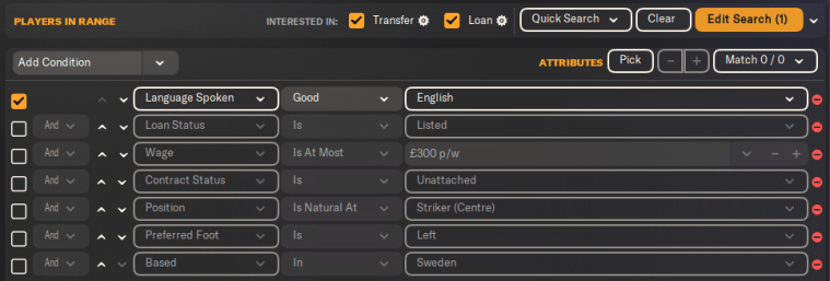 Although Nacka are based in Sweden, English is the ‘lingua franca’ at this club. Therefore, any incoming signings I make will have to speak English to at least a Good level. I have set up a search filter on the player search screen to this effect.