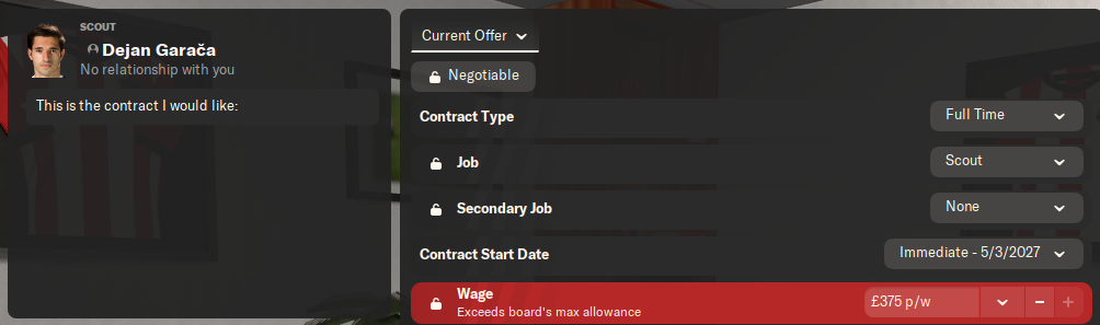 I’m not exaggerating when I say that every single unemployed staff member in the game was demanding at least £350 per week to join Nacka – even those that were absolutely useless at their jobs! (By comparison, my new full-time contract as manager pays me only £325 per week!)