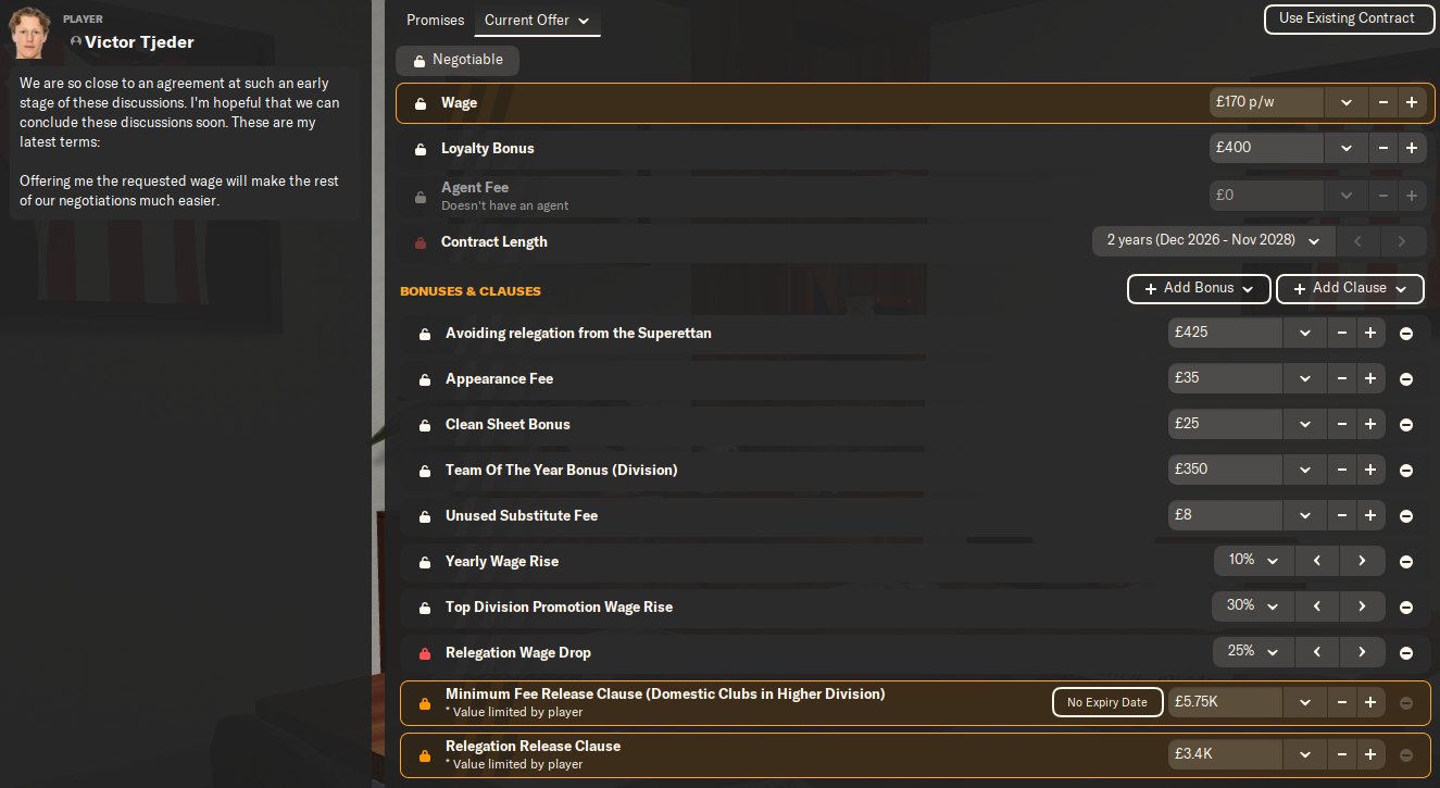 When you’re negotiating new contracts, don’t forget to put in Relegation Wage Drop clauses of at least 25% – especially if you expect to struggle next season. If they don’t like that, offer some higher bonuses or signing-on fees to sweeten the deal. That way, if the worst does happen and your team is relegated, the reduced wages will soften the financial blow.