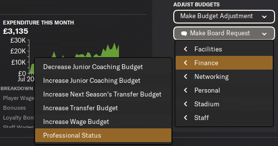 You can also ask your board to turn professional at any point. Go to the Finances page, then open up the Make Board Request menu and click Finance > Professional Status.