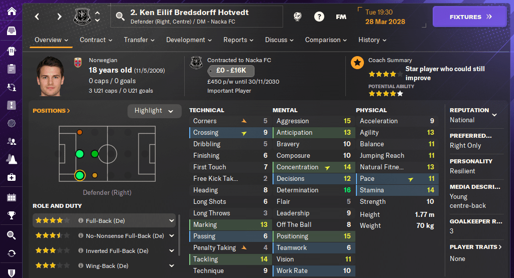 I signed three Norwegian teenagers, though only one has gone straight into the first-team. Ex-Stabæk defender Ken Eilif Bredsdorff Hotvedt is a resilient right-back with top-flight potential (forget what his profile says – he’s NOT a centre-back).