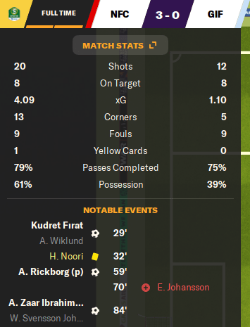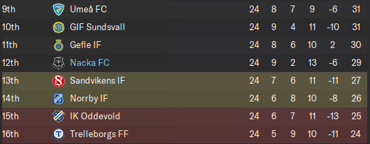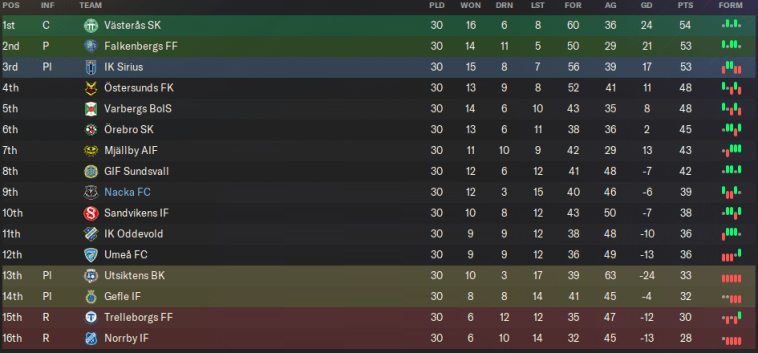 But then we lost tamely at home to Sandviken, before our 4-4-2 was destroyed by Mjällby’s 4-3-3 (an FM story as old as time). Fortunately, we bounced back in our final home game – a 2-1 win that relegated Trelleborg and secured our survival.