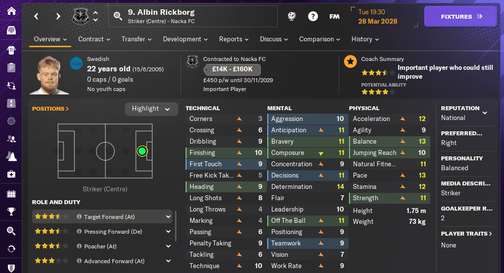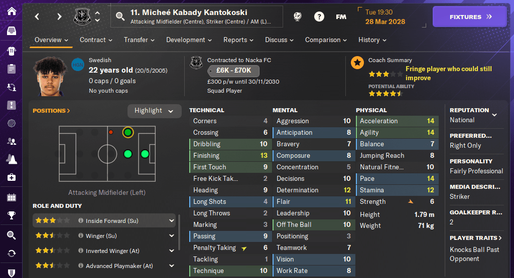 I wouldn’t normally sign a player with such low Teamwork, but with such great key attributes, I’m happy to take a gamble on him.