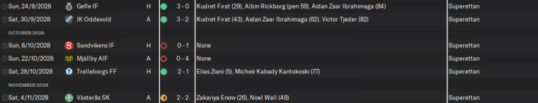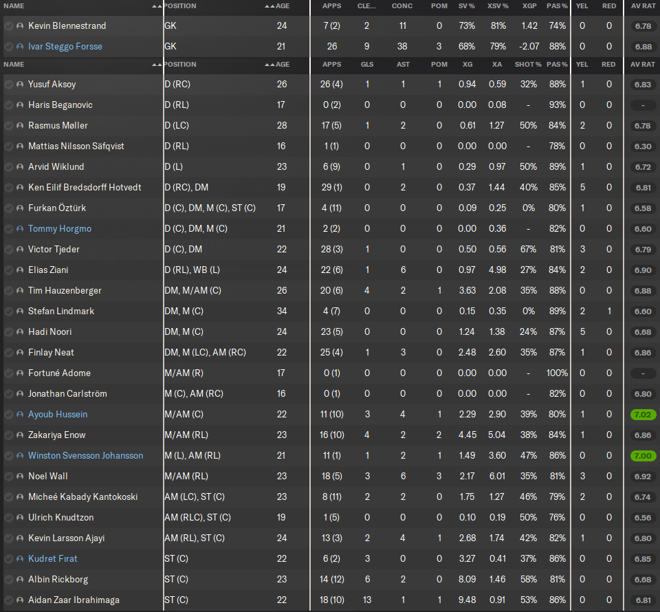 Lack of experience notwithstanding, hardly any Nacka players covered themselves in glory. Our only two players to get an average rating of at least 7.00 were both loanees. We have a chance to sign Hussain on a free transfer this winter… but knowing FM24, it will be almost impossible to bring Winston back for a second loan spell. Oh well.