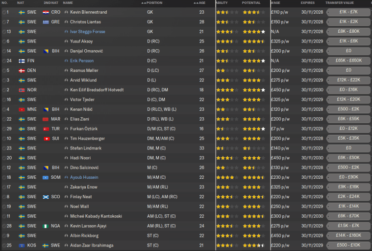 And so, after an unusual Fuller FM transfer window in which I didn’t replace half the squad for no reason, this is how we are shaping up for our second Superettan season.