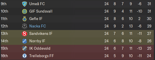 But then we lost tamely at home to Sandviken, before our 4-4-2 was destroyed by Mjällby’s 4-3-3 (an FM story as old as time). Fortunately, we bounced back in our final home game – a 2-1 win that relegated Trelleborg and secured our survival.