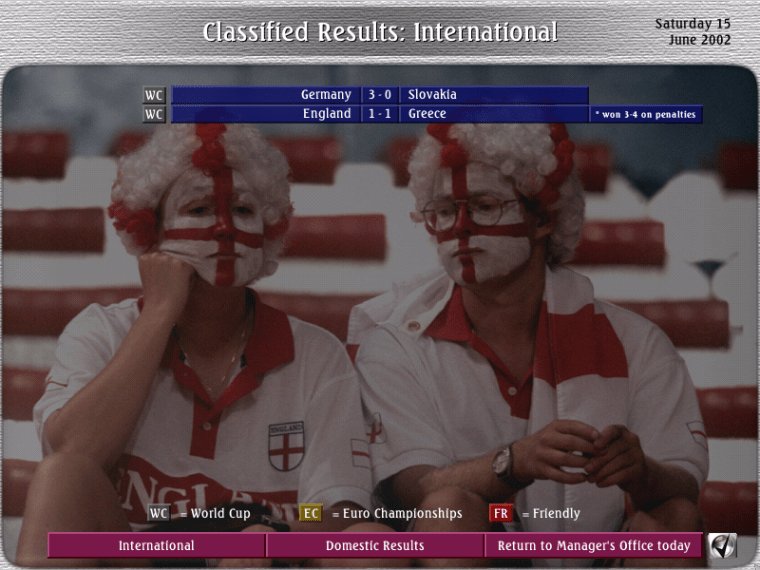 Although World Manager can let you play on into Euro 2004, one tournament was enough for me. A messy interface, a slew of bugs, and the fact you are only allowed to manage one nation made this a miserable experience all round.