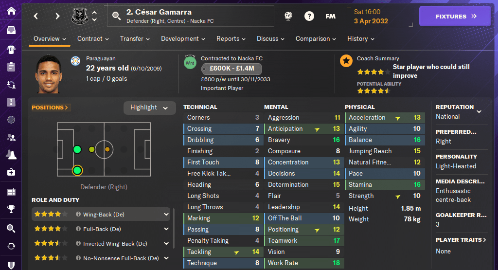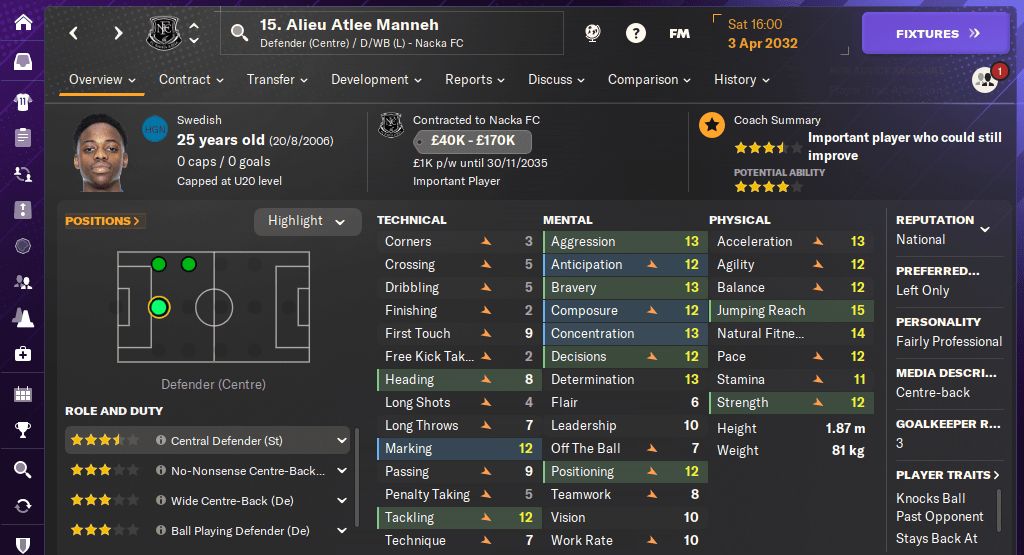 Given our defensive frailties last year, new centre-halves were a priority. I was delighted to bring back our tough-tackling former loanee Erik Melin, who has now signed a four-year contract at Nacka. Hopefully that will stop Häcken from recalling him two weeks before the end of the season… but this is FM, so you can’t be too sure.