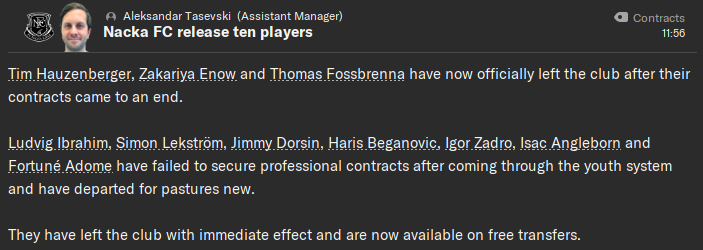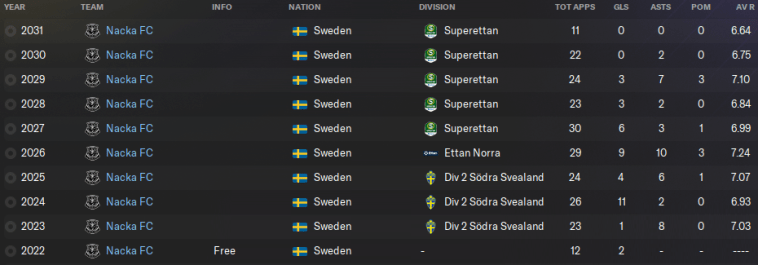 We also waved off the last of my original players. Midfielder Tim Hauzenberger had been an integral player for Nacka since arriving in 2022, when they were still in Division 3. He played in a club-record 224 league matches (189 of them under my management), scored 39 goals, and made 40 assists.