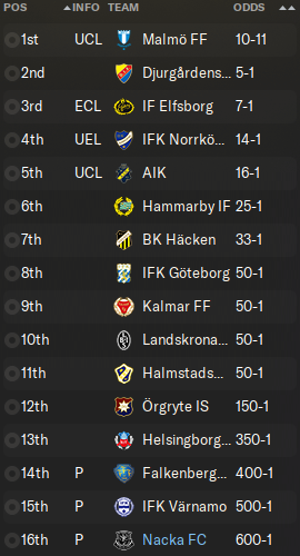 Considering that we’re a newly-promoted team, the Nacka board are surprisingly optimistic. Their expectations are to “avoid relegation”, which I believe means “avoid automatic relegation”. Ideally, I’d like to avoid the relegation play-off as well – especially because the last time I got into that situation in a Scandinavian league, it went HORRIBLY badly.