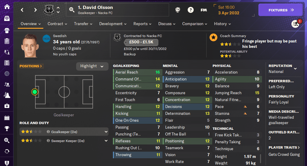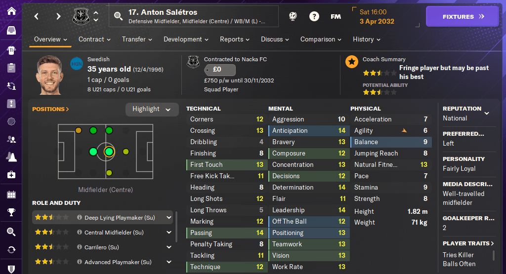 Tim didn’t see much action in the Superettan last season, and he was definitely not up to Allsvenskan standard. Now aged 29, I decided to let him find another club in a lower division… or, knowing FM, retire from playing to become the world’s most incompetent scout.
