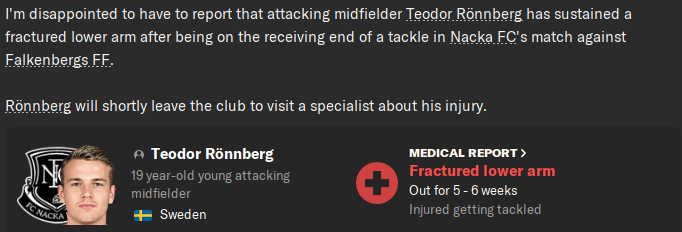 …and then broke his arm seven minutes later. Such is the way with FM.